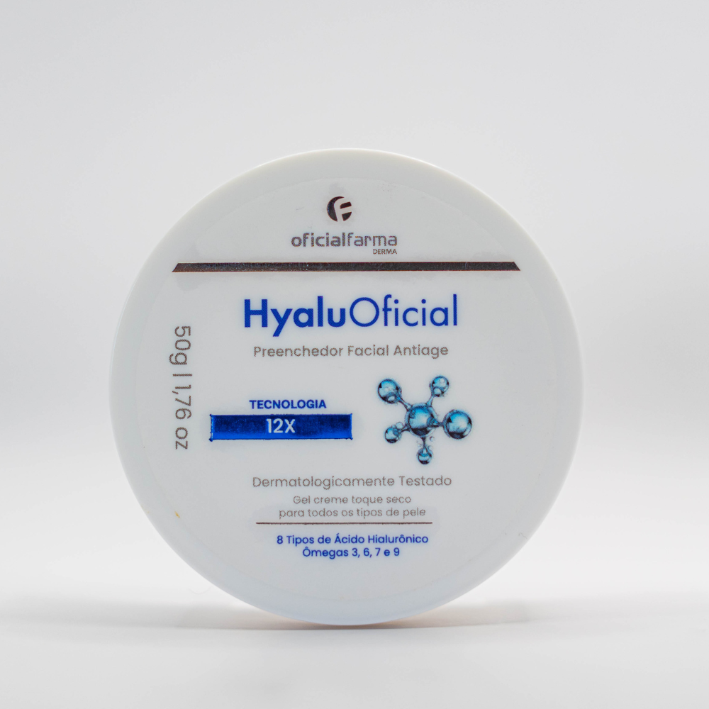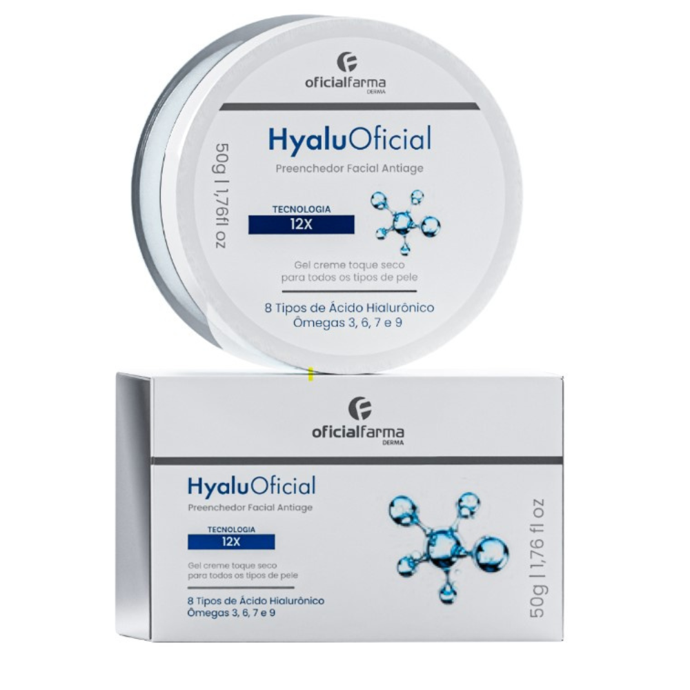O HyaluOficial Preenchedor Anti-Idade 12X é formulado com o Ácido Hialurônico em cascata e os Ômegas 3, 6, 7 e 9 para estimular a produção de colágeno e reparar profundamente as tramas de sustentação da pele.